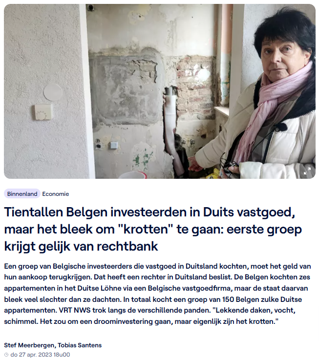 27 april 2023: ‘Tientallen Belgen investeerden in Duits vastgoed, maar het bleek om “krotten” te gaan: eerste groep krijgt gelijk van rechtbank.’